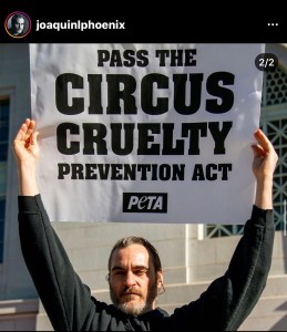 一、「小丑」瓦昆菲尼克斯 (Joaquin Phoenix)的各種動物保護行動在電影領域擁有精彩成就的「小丑」瓦昆菲尼克斯 (Joaquin Phoenix),我們後面就簡稱「小丑瓦昆」,他還有一個自己不默默長期投入的志業,那就是捍衛動物保護與動物權益運動。很驚人的是,他是因為三歲去釣魚時,親眼看到殺魚的過程覺得很傷心,所以他三歲就決定開始吃素到現在!知道這件後我自己就秒追蹤「小丑瓦昆」的IG了。他近期被美國「善待動物組織 (PETA) 」評選為「年度風雲人物」,因此跟PETA協會合作了許多的動物權益宣傳活動,在他IG上就可以看到很多他參與活動的照片,像是一張他跟雞重疊的照片,上面寫著We are All Animal,就曾經出現在紐約時代廣場大型廣告看板上,這版位應該超級貴。「小丑瓦昆」也曾經在加州跟立法委員共同推動要立法禁止馬戲團訓練野生動物來表演,「小丑瓦昆」自己走上街頭,高舉著「拒絕馬戲團殘忍表演」的牌子。這些照片我也都會放在部落格的廣播原文裡,以及FB的粉絲專頁,來幫我們按個讚就可以看到囉!