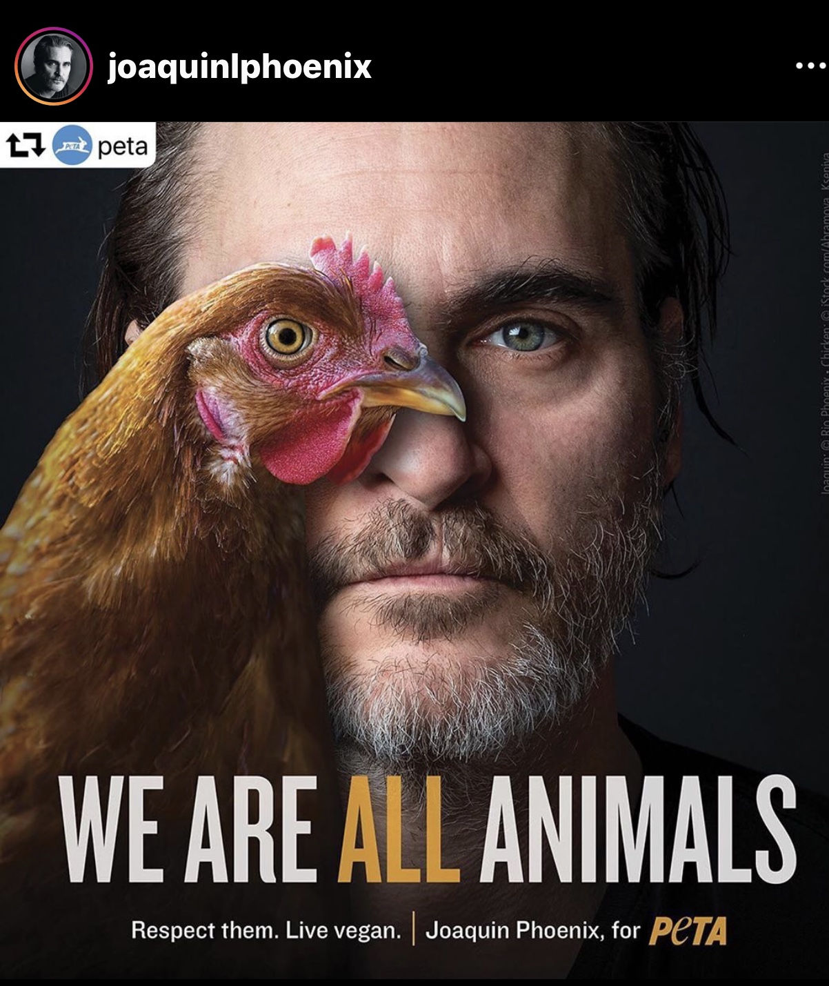 一、「小丑」瓦昆菲尼克斯 (Joaquin Phoenix)的各種動物保護行動在電影領域擁有精彩成就的「小丑」瓦昆菲尼克斯 (Joaquin Phoenix),我們後面就簡稱「小丑瓦昆」,他還有一個自己不默默長期投入的志業,那就是捍衛動物保護與動物權益運動。很驚人的是,他是因為三歲去釣魚時,親眼看到殺魚的過程覺得很傷心,所以他三歲就決定開始吃素到現在!知道這件後我自己就秒追蹤「小丑瓦昆」的IG了。他近期被美國「善待動物組織 (PETA) 」評選為「年度風雲人物」,因此跟PETA協會合作了許多的動物權益宣傳活動,在他IG上就可以看到很多他參與活動的照片,像是一張他跟雞重疊的照片,上面寫著We are All Animal,就曾經出現在紐約時代廣場大型廣告看板上,這版位應該超級貴。「小丑瓦昆」也曾經在加州跟立法委員共同推動要立法禁止馬戲團訓練野生動物來表演,「小丑瓦昆」自己走上街頭,高舉著「拒絕馬戲團殘忍表演」的牌子。這些照片我也都會放在部落格的廣播原文裡,以及FB的粉絲專頁,來幫我們按個讚就可以看到囉!